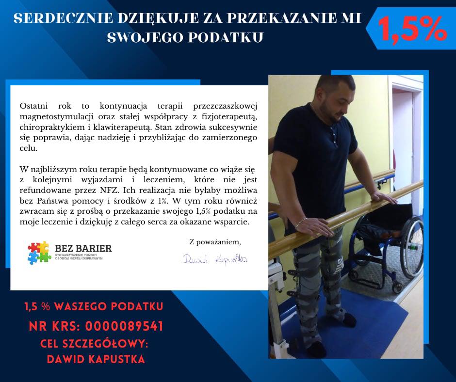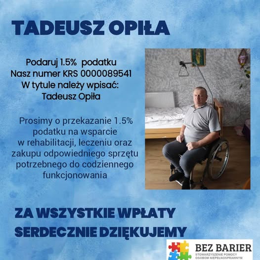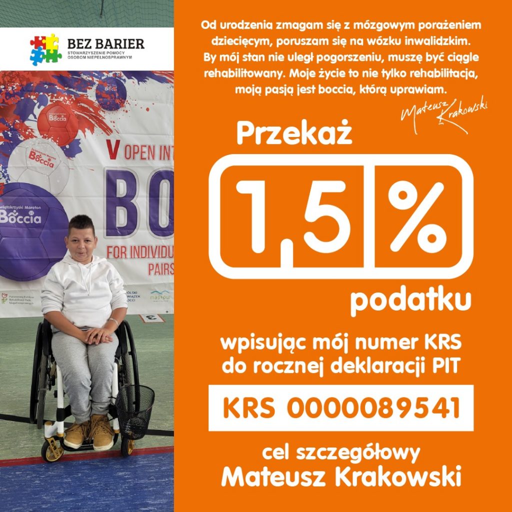 Stowarzyszenie Pomocy Osobom Niepełnosprawnym „Bez Barier” prowadzi na ich rzecz subkonta do wpłat celowych 1,5% podatku dochodowego od osób fizycznych.